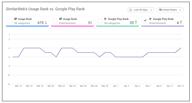 The below graph from Similarweb shows that the Bitmoji app ranks 31st in the entertainment industry, 35th in Google play rank among all categories and it stands 4th in the entertainment app category.