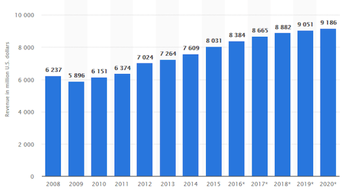 Here is a complete chart that takes you through the growth in car wash and auto detailing market in the U.S. from 2008 to 2019.