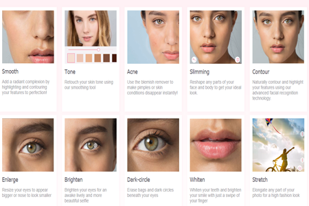 - Retouch skin tone using our exclusive skin smoothing makeover tool