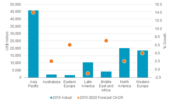 Within APAC, China is dominating the market with a stunning CAGR of 55%. On the other hand, India managed to gain the 2nd position but remained so distant to that of China. Well the two markets combined total foodservice value is worth more than 28% of the global total. The other APAC markets in Southeast Asia have high growth potential despite their relatively small sizes.