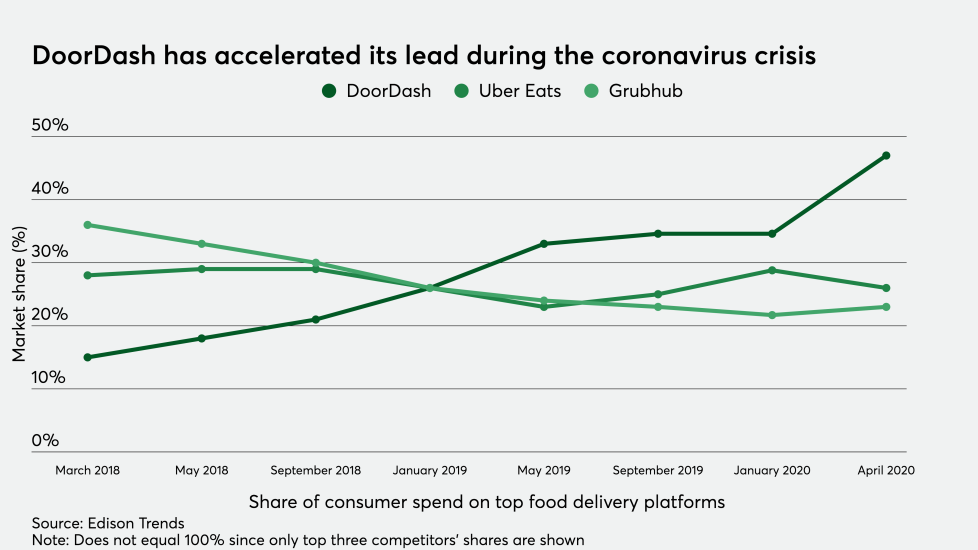 Edison Trends has also released a study of over 190,000 transactions made in the US food delivery market in April, shows that 47% of them belong to DoorDash, followed by Uber Eats at 26%, and then, Grubhub with 23%.
