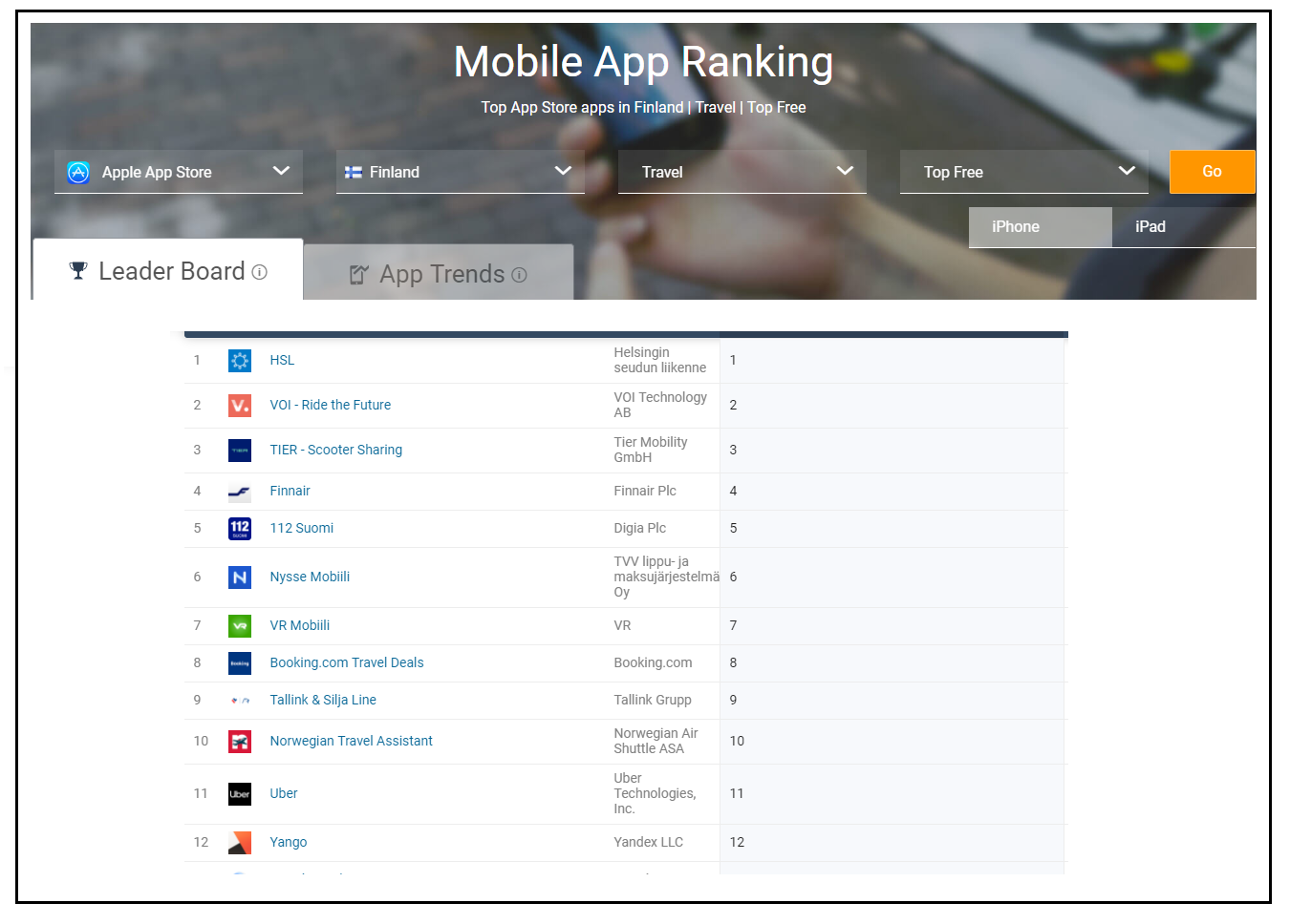 Another chart from Finland shows the Yandex app ranking as 12th in the travel category. Yandex is popular as Yango in Finland.