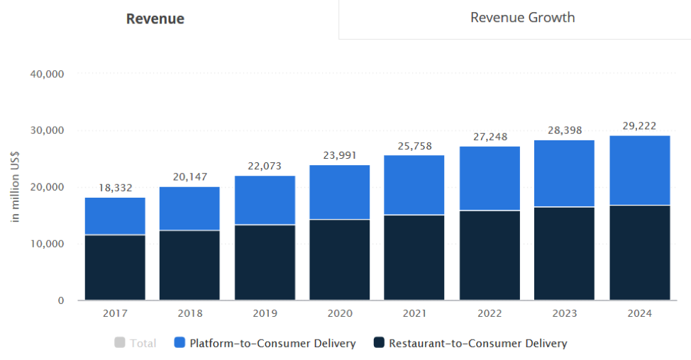 Another report published by Statista on on demand food delivery apps mentions the revenue of the USA food delivery market amounts to USD 23.9 Billion in the year 2020 and estimates a whopping hike of USD 29.2 Billion by the year 2024 in the revenue.