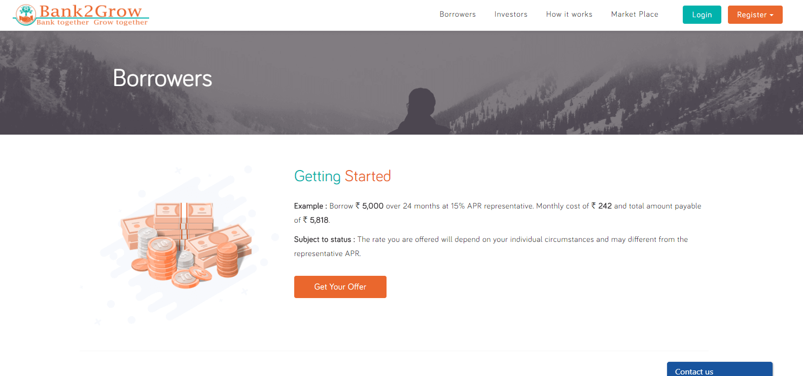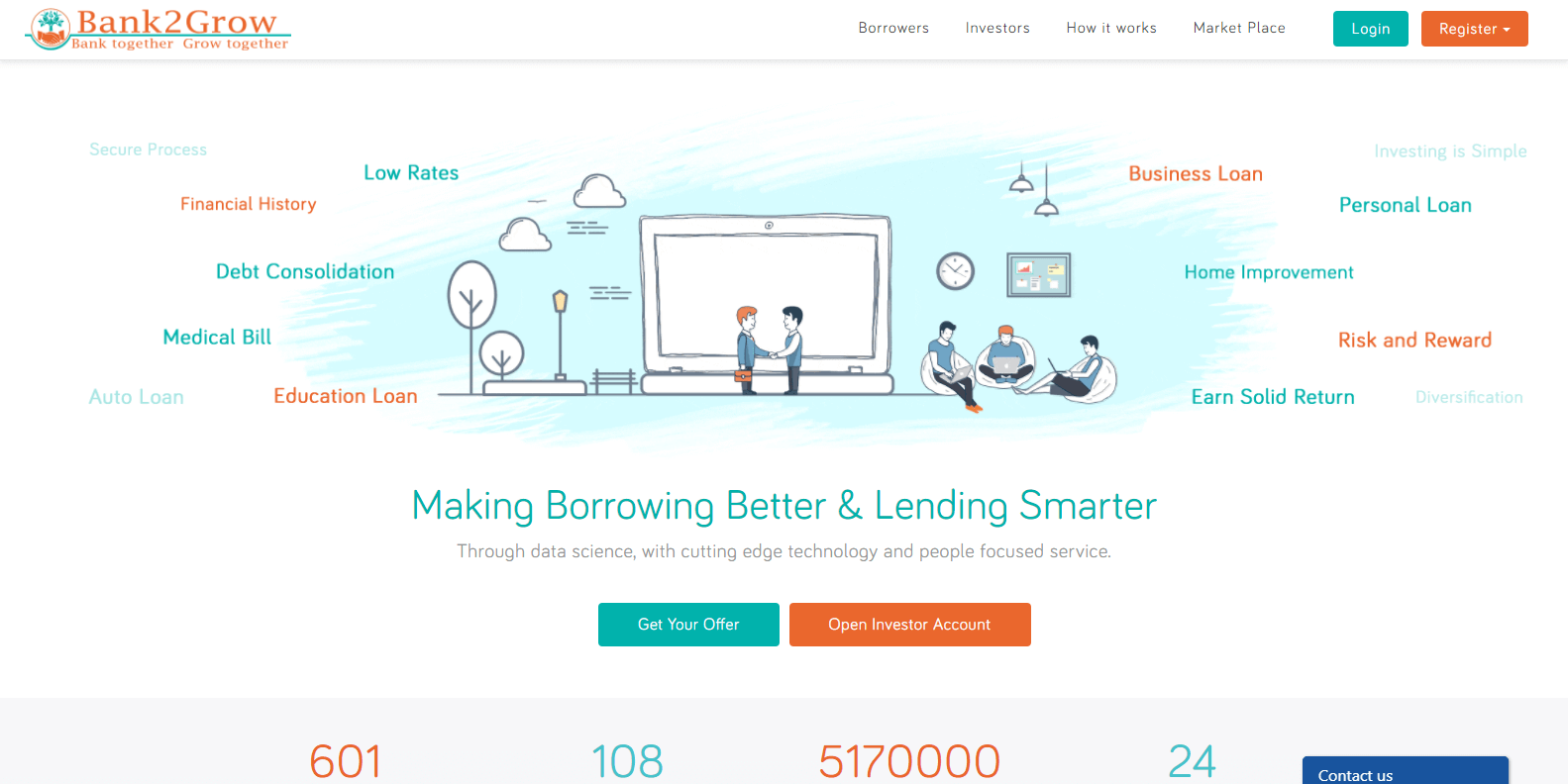 The borrowers need to register and fill out a form stating their loan requirements and the EMI payable. The Bank2Grow will validate the borrowers based on their CIBIL score combined with a pre-defined algorithm defined by the company. The borrowers are assigned a grade, which validates them for the lender. The system runs algorithms, which takes huge amount of data as parameters, assess the data and proposes a final loan offer to the borrower.