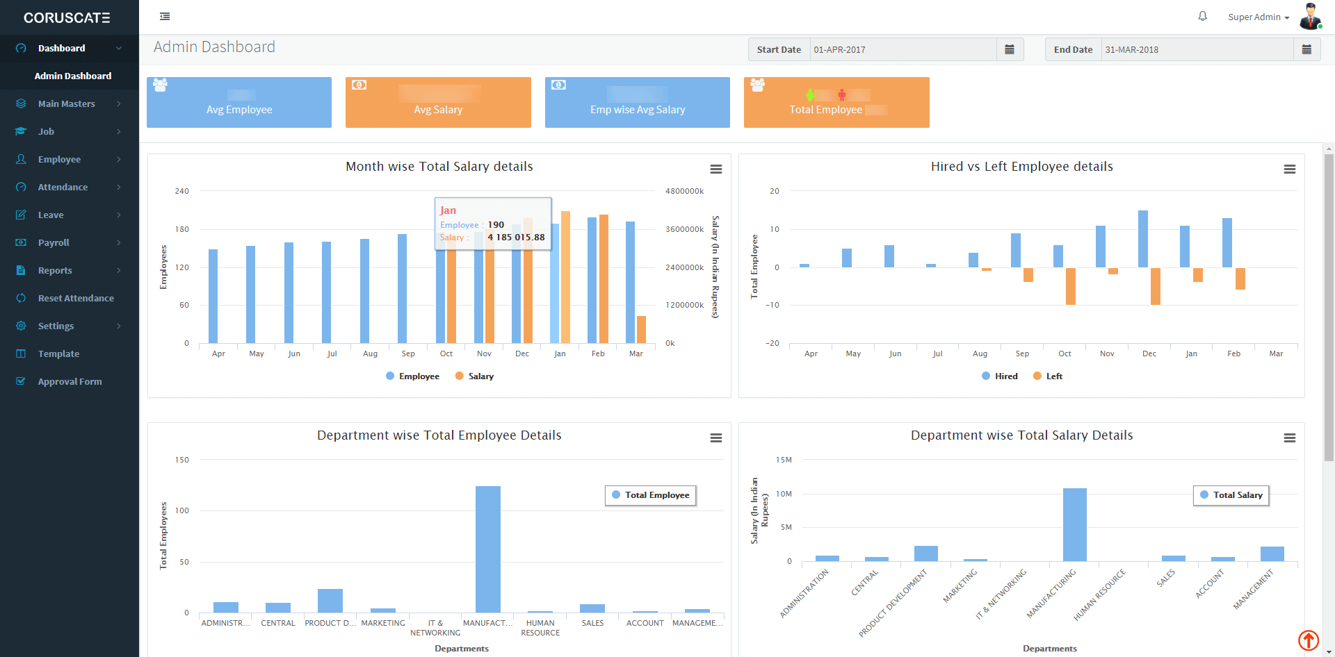 - The dashboard allows the manager to see a complete view of the employees, salary and leaves.